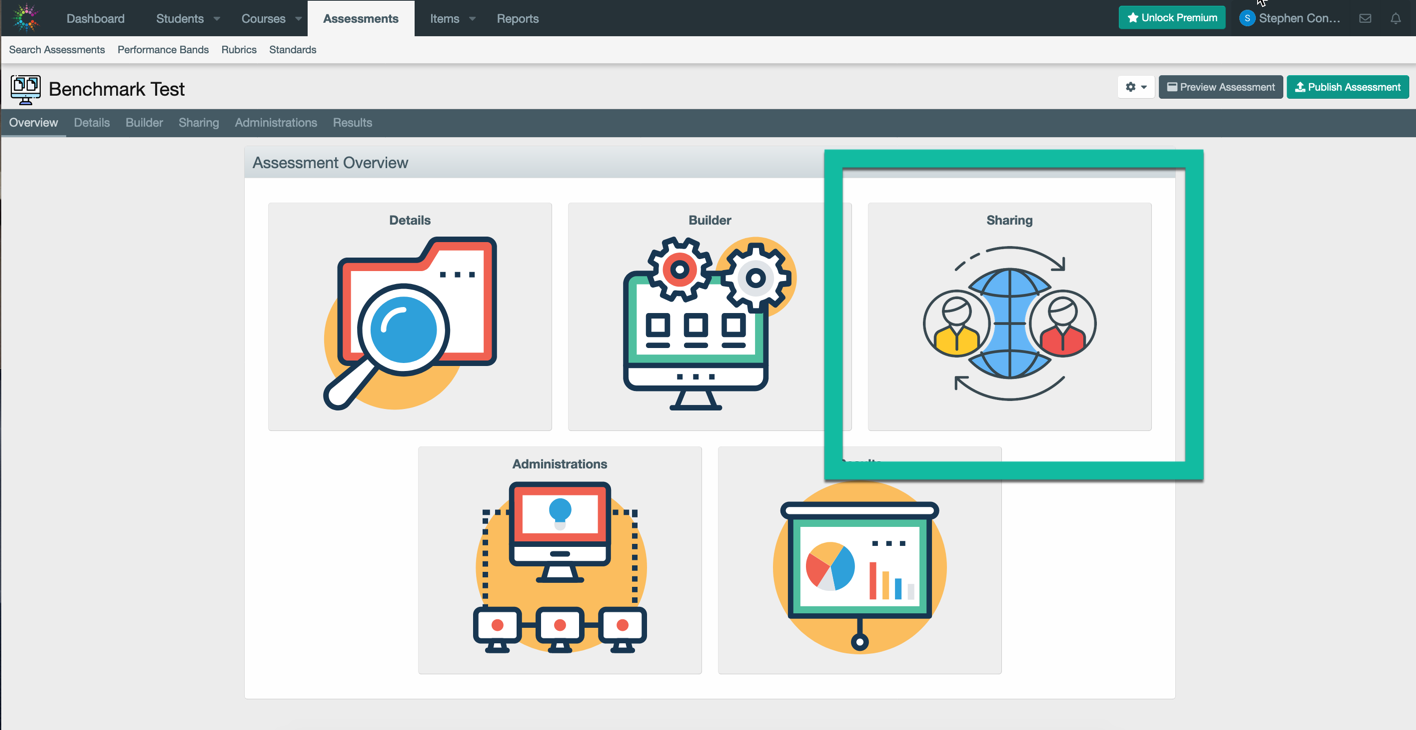 In Classify Learning, you can create an assessment and share it with another user via a share URL link that will take the user directly to the assessment shared with them. You can also decide what the other user can do with your assessment once accessed. To share an assessment to another user, start from within the assessment you'd like to share and click on the Sharing tile.